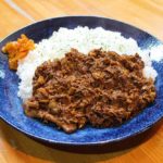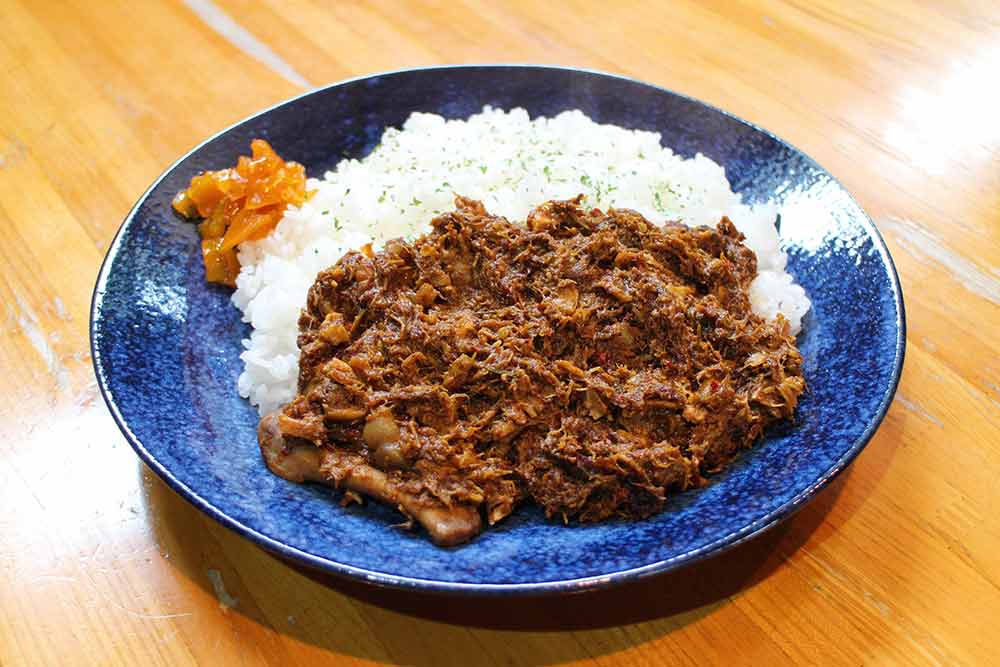 地元客の多くが注文するのは写真のチキンカレー(900円)です。チキンカレーと聞いてイメージする見た目とは少し違うかもしれませんが、手羽元をほぐしたチキンがベースになっいて、スパイス風味が強いチキン版のキーマカレーのようなカレーです。