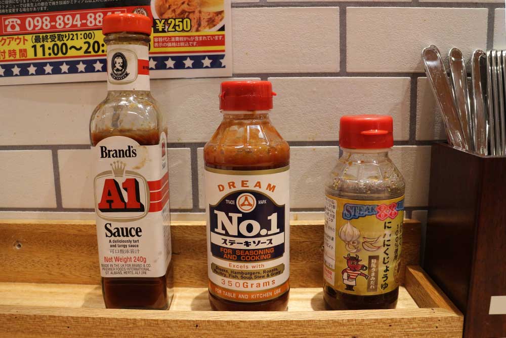 ステーキソースはA1ソースという酸味がかったソースが沖縄では人気ですが、お店オリジナルのソースがおいてあったりと好みでアレンジすることができます。