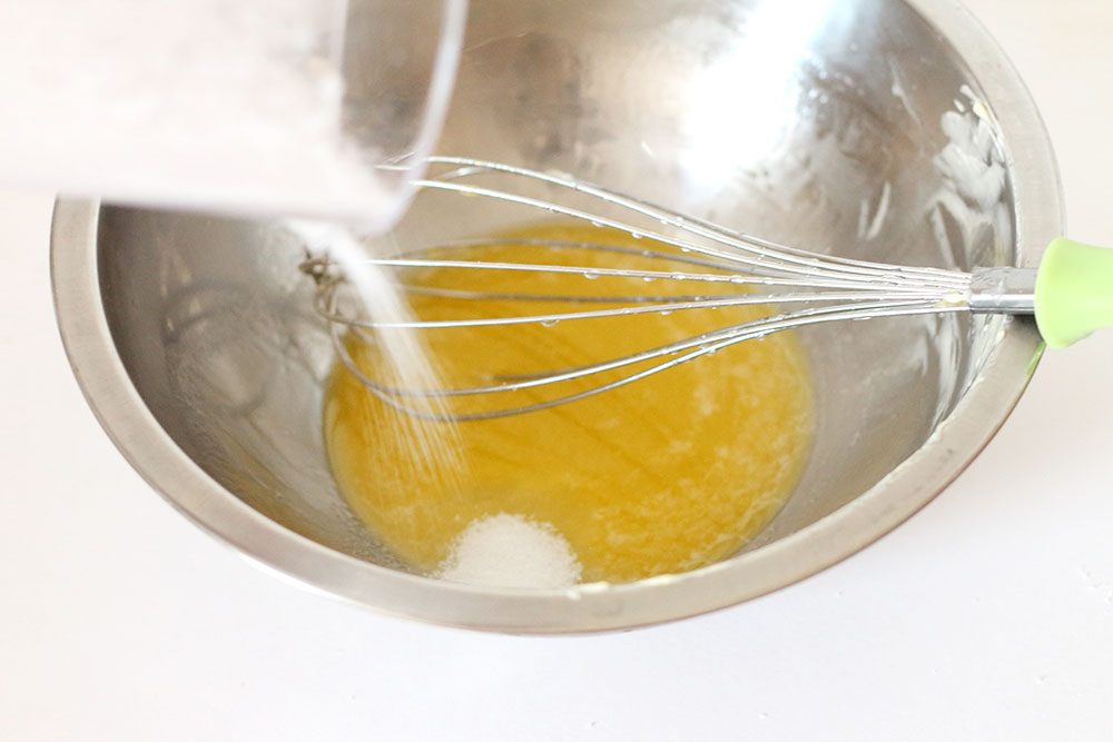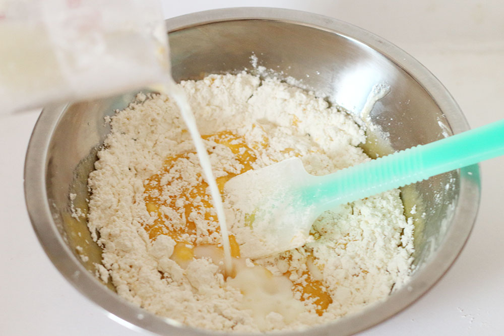 薄力粉、ベーキングパウダー、牛乳を2回に分けて入れて混ぜる。
